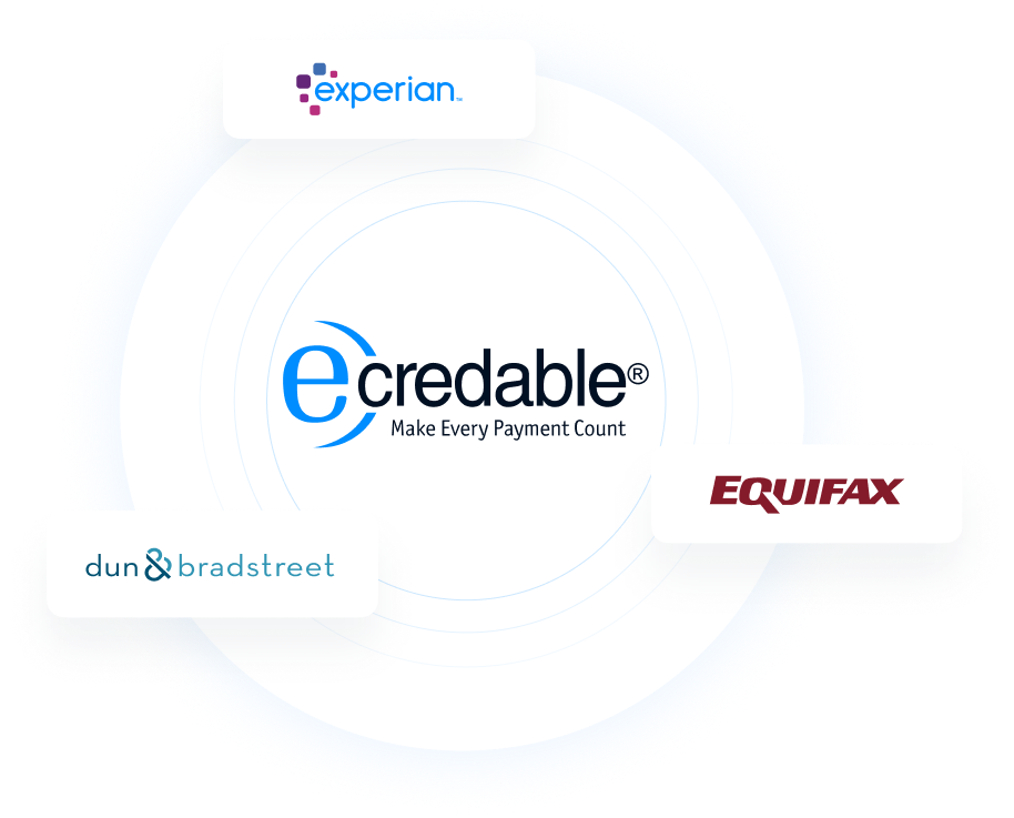 Dun & Bradstreet, Equifax and Experian accept the eCredable Business Subscription payment. Equifax accepts eligible eCredable verified bills to add to the business file. Results may vary between business credit bureaus and/or the partner products. Not all lenders use D&B, Experian, or Equifax business credit reports, and business credit scores reported by eCredable. [Learn more]